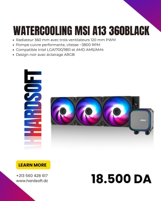 Refroidissement : MSI MAG A13 360 Black, water cooling AIO 360 mm, pompe haute performance, 3 ventilateurs ARGB 120 mm, support AM5