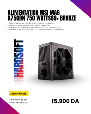 Alimentation : MSI MAG A750BN 750 W 80+ Bronze PCIe 5.0, ventilateur 120 mm silencieux, protections OPP/OVP/SCP, connecteur 16-pins GPU