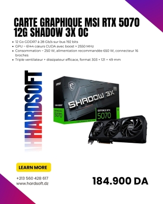 Carte graphique : MSI RTX 5070 12G Shadow 3X OC, 12 Go GDDR7 192 bits, boost ? 2550 MHz, TGP 250 W, triple ventilateur TORX 5.0, PCIe 5.0