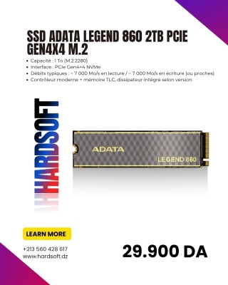 SSD : ADATA Legend 860 2 To PCIe Gen4x4 M.2, lecture ? 7400 Mo/s, écriture ? 6800 Mo/s, mémoire 3D TLC NAND, dissipateur intégré