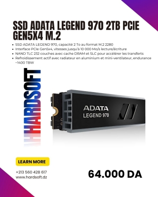 SSD : ADATA LEGEND 970 2 To — interface PCIe Gen5 x4, jusqu’à 10 000 Mo/s lecture/écriture, refroidissement actif