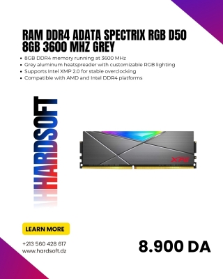 Mémoire vive : 2×8 Go ADATA Spectrix D50 RGB 3600 MHz, total 16 Go, dissipateur aluminium gris, support XMP 2.0.